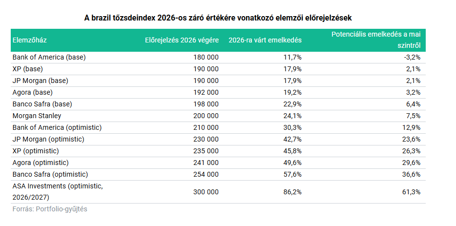 A brazil tőzsdére szóló jelenlegi várakozások kifejezetten pozitívak: a nagyobb és kisebb elemzőházak közül többen 250 ezer pontos, vagy akár azt meghaladó várakozásokat fogalmaztak meg a brazil tőzsdeindex 2026-os záró értékére, a legvadabb elképzelés szerint 300 ezerig szárnyalhatnak a brazil részvények, igaz, nem feltétlenül idén, hanem 2027-ig előretekintő horizonton (ASA Investments).