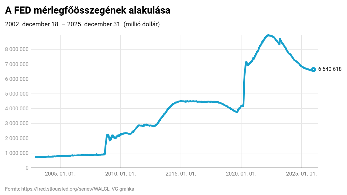 Érdemes visszagondolni arra a megállapításra, hogy a rövid ciklusok csúcsa magasabban alakul az előző ciklus csúcsánál. Ennek vizualizálására kifejezetten alkalmas a FED mérlege, amelyen látszik, hogy a 2008-as beavatkozás óta minden lazítási hullám csúcsánál egyre magasabban alakul a mérlegfőösszeg. Az is megfigyelhető, hogy a mérleg csökkent az elmúlt szigorítási időszakban, amely párhuzamban áll a második bekezdésben részletezett logikával. Ugyanakkor a jegybank már 6 alkalommal összesen 1,75%-kal csökkentette az alapkamatot, miközben a mérlegfőösszeg nagyságrendileg azon a szinten van, mint 2020-ban, miután közel 3000 milliárd dollárral növelte azt alig pár hónap alatt.